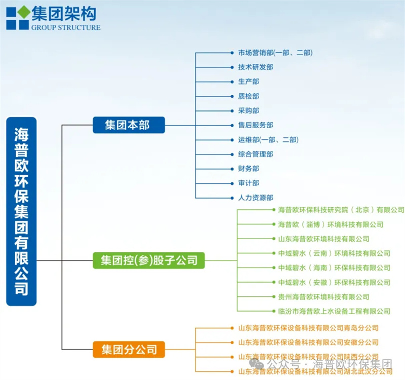 公司擁有環境工程專項設計乙級資質,環保工程專業承包壹級資質、市政公用工程施工總承包二級資質、建筑機電安裝工程專業承包二級資質等資質,并通過了ISO質量、環境、職業健康安全管理體系認證。同時取得了水污染治理設施運維能力評價二級,實現從設計、生產、安裝、調試、到運維的產業鏈一條龍服務。集團架構